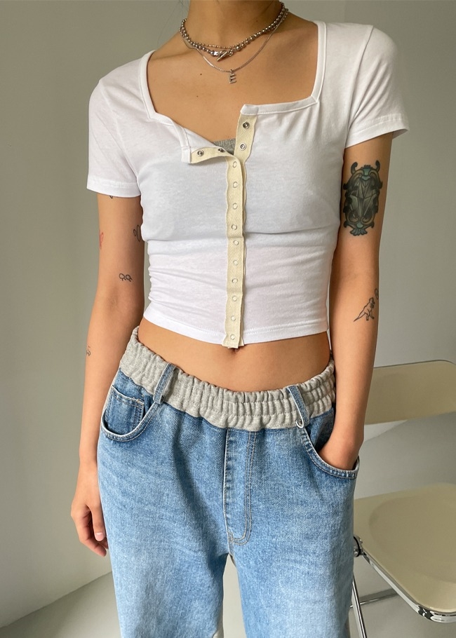 스퀘어버튼 크롭티셔츠