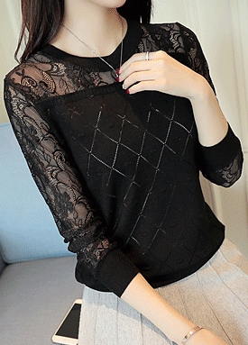 [재입고] 아일렛 짜임 레이스 포인트 니트 블라우스