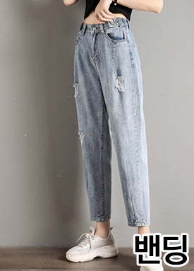 옆단추 뒷밴딩 데미지 데님 팬츠