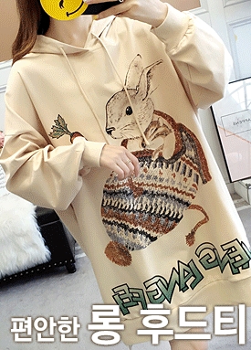후드 래빗 프린트 롱 티셔츠