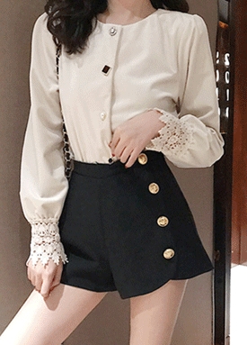 손목 레이스 믹스 버튼 벨벳 블라우스