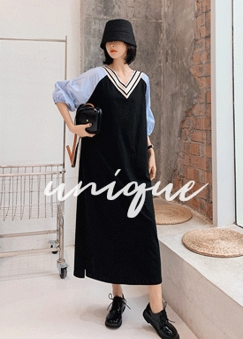 배색 브이넥 나그랑 스트라이프 소매 원피스