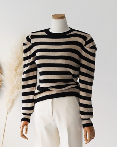 어깨 퍼프 셔링 스트라이프 니트