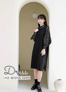 볼륨 슬리브 체크 셔츠 레이어드 디자인 원피스+벨트 세트