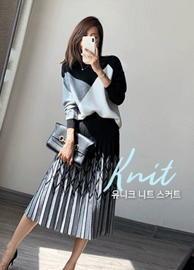 [당일발송] 더블 다이아 배색 플리츠 니트 밴딩 스커트