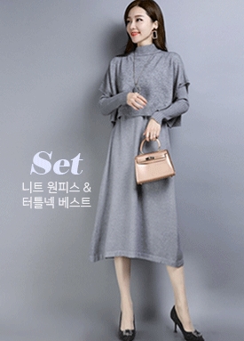 [당일 발송]반넥 가오리 베스트+부분 골지 플레어 니트 원피스 세트
