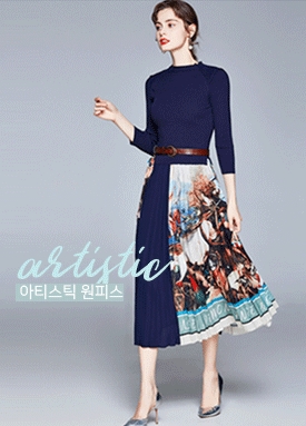 언발 아티스틱 플리츠 스커트 5부 소매 원피스+벨트 세트