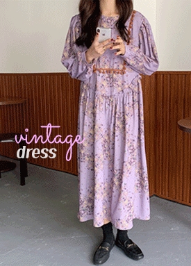 [당일발송] 스퀘어 니팅 플라워 패턴 볼륨 소매 원피스