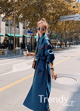 배색 바이어스 트렌디 벨티드 롱 코트