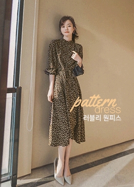 [당일 발송] 하이넥 플라워 패턴 플레어 원피스+허리끈 세트