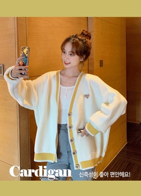 곰돌이 자수 배색 가디건