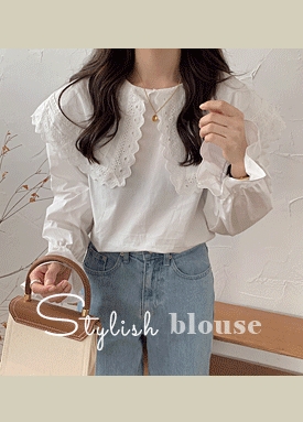 [재입고] 코튼 스판 레이스 빅 카라 화이트 블라우스