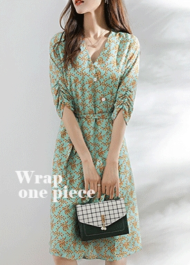 브이넥 랩 버튼 벨티드 원피스