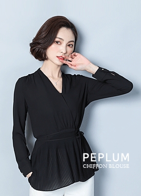블랙 쉬폰 페플럼 랩 블라우스