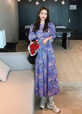 비비드 플라워 퍼프 반팔 스모크 밴딩 원피스