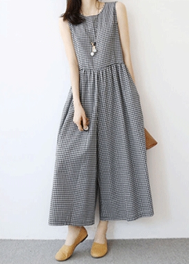 [재입고] 체크 패턴 핀턱 와이드핏 점프수트