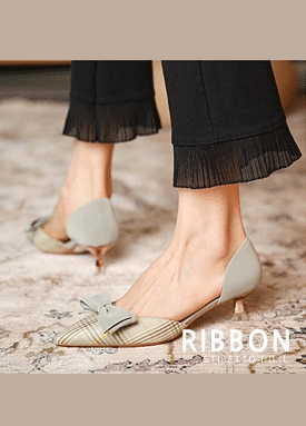 리본 체크 스텔레토 미들 힐 구두