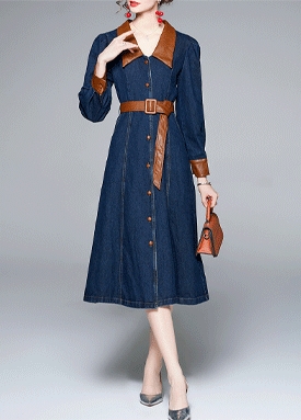 [당일발송] 레더 배색 벨티드 데님 원피스
