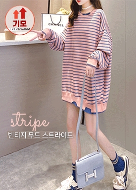 [재입고] 빈티지 넥 프린팅 기모 안감 스트라이프 티셔츠