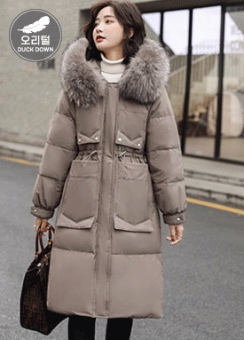 허리 스트링 덕다운 롱 패딩
