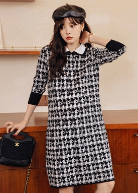 체크 패턴 니트 카라 원피스