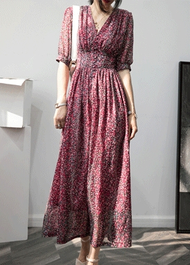 [재입고] 뒷밴딩 브이넥 버튼 잔꽃 원피스