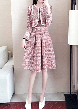 [빠른출고]트위드 진주 원피스+노카라 자켓 세트
