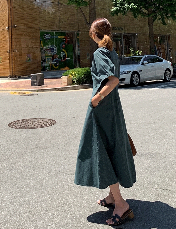 에르 절개 핀턱 퍼프소매 롱 원피스