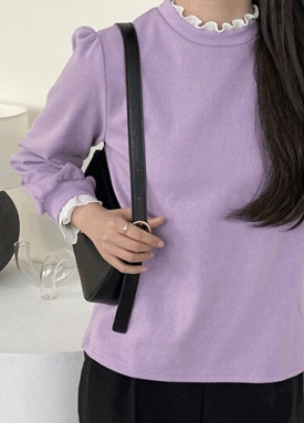 프릴 배색 어깨 셔링 티셔츠