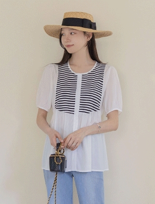 스트라이프배색 퍼프소매 루즈핏블라우스