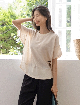 밑단배색 리본자수 쿨블라우스
