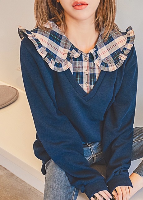 체크프릴카라 니트배색 티셔츠