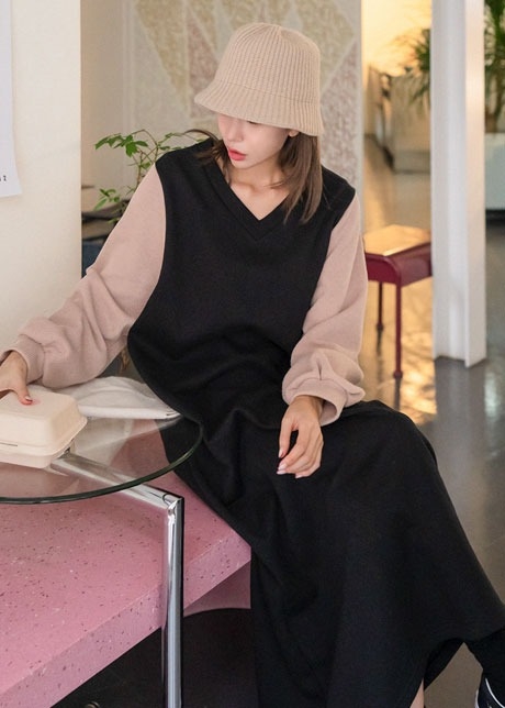 리전 소매배색 기모원피스