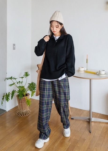 울 체론 체크 와이드팬츠