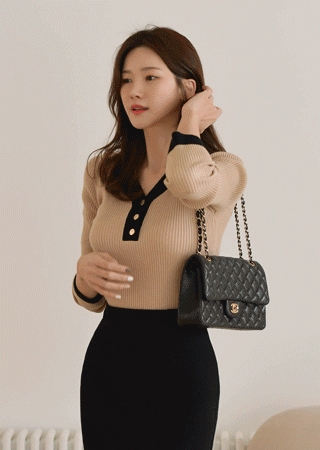 골지 배색 단추 니트