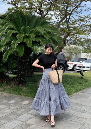 밴딩 체크 롱 스커트