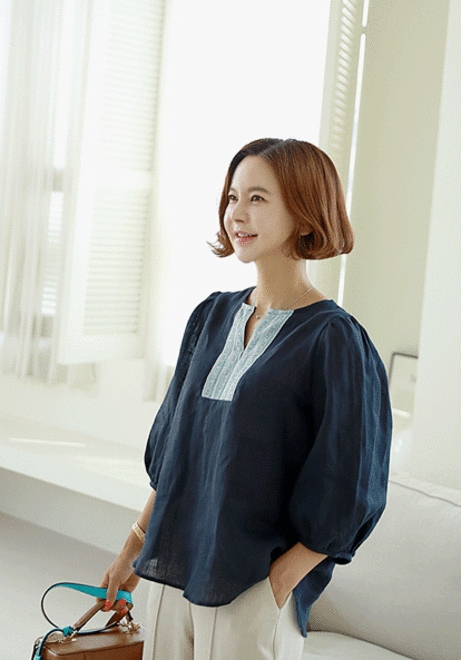 반오픈 배색블라우스