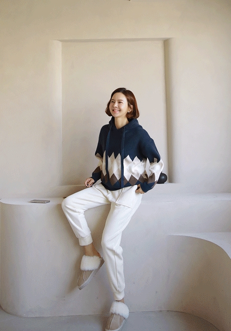 3단배색 다이아후드니트
