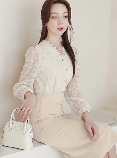 마크라메 자수 레이스 진주버튼 블라우스