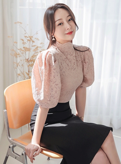 볼륨 벌룬 슬리브 하이넥 레이스 블라우스