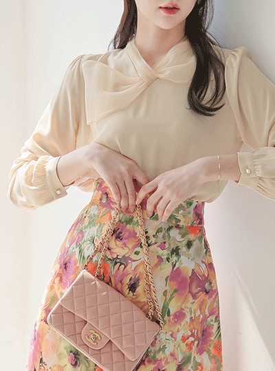 오간자 리본 핀턱 V넥 블라우스