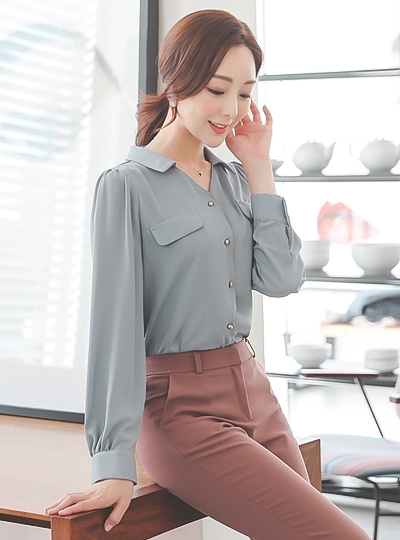 브이넥 더블 플랩포켓 골드버튼 블라우스