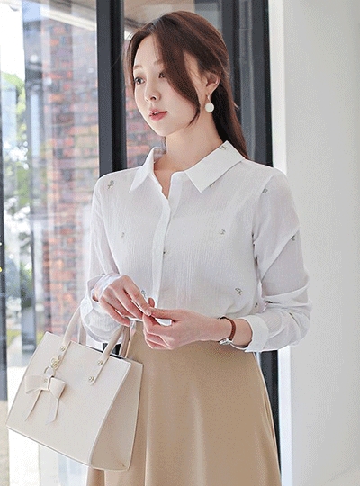 플라워 자수 요루 코튼 백리본 블라우스