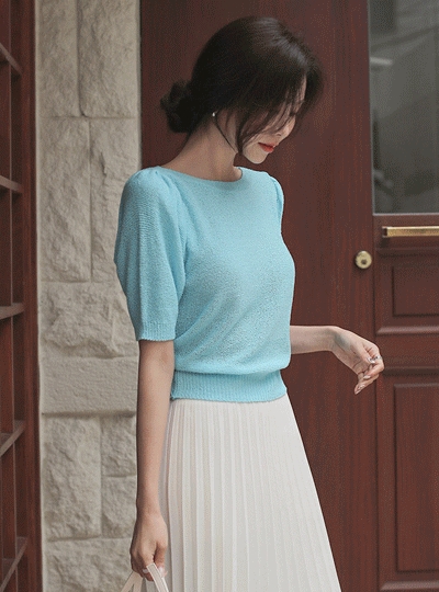 보트넥 비비드 컬러 하찌 퍼프소매 니트