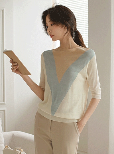 딥 브이라인 배색 아렌 시스루 니트티