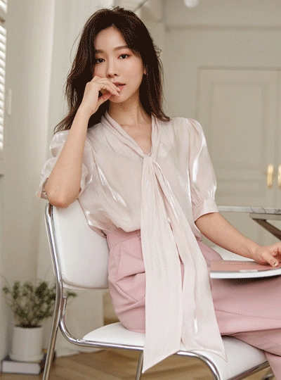 새틴 글로시 5부 퍼프소매 타이 블라우스
