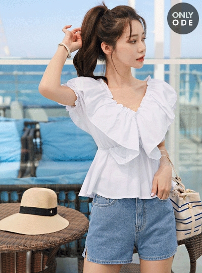 양브이넥 미니프릴 코튼 블라우스
