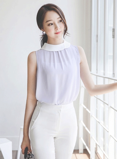 플랫 튤립카라 배색 셔링 블라우스(민소매)