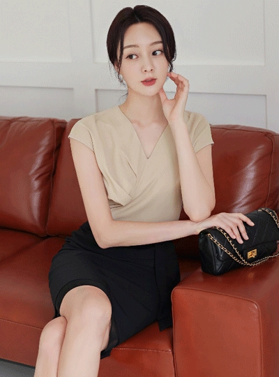 언발 핀치셔링 브이넥 프렌치 슬리브 블라우스