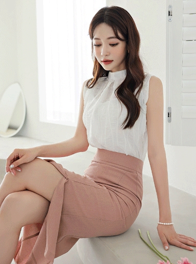 시스루 웨이브 링클 하프넥 슬리브리스 블라우스